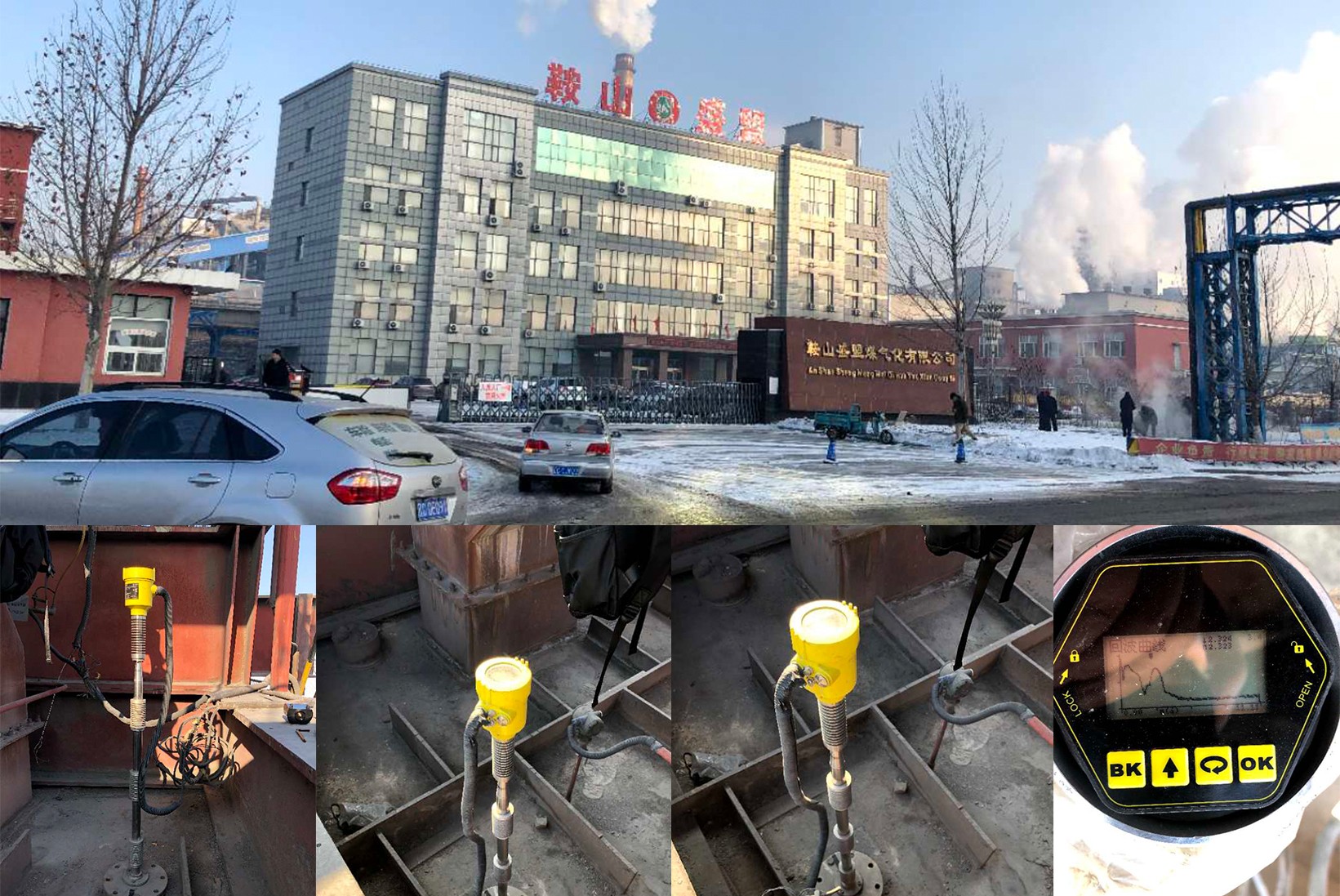 • 山東鋁業該現場主要主要以測量污水、水泥漿液為主,大多部多有攪拌、蒸汽,選購 RBRD17 共計 32 臺。罐內有攪拌槳,攪拌槳一下液位無法測量,因雷達安裝正下方是有攪拌葉片,且葉片寬度、層數比較多,所以無法測量。現場蒸汽比較大?,F場安裝圖?,F場安裝圖,安裝位置為罐子直徑四分之一處?,F場安裝圖?,F場環境圖。現場安裝圖